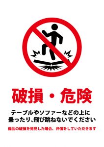 テンプレート内文章「破損・危険 テーブルやソファーなどの上に乗ったり、飛び跳ねないでください 備品の破損を発見した場合、弁償をしていただきます」